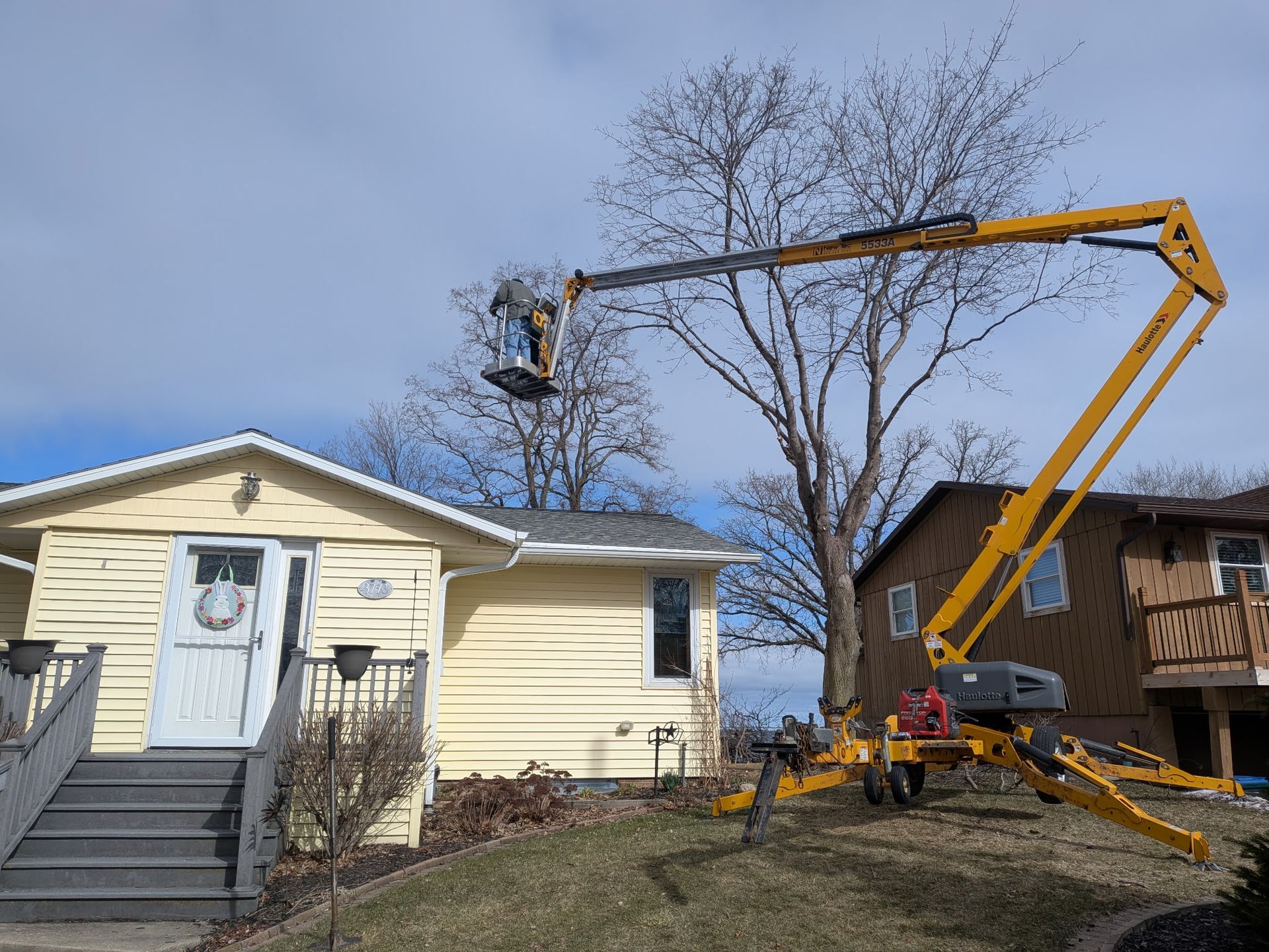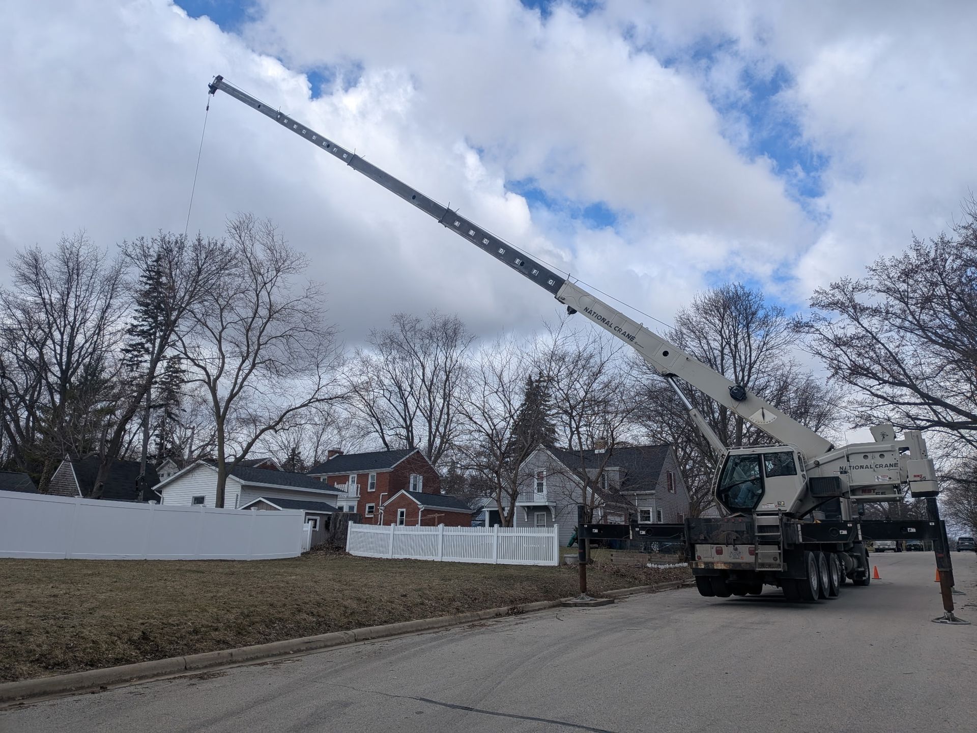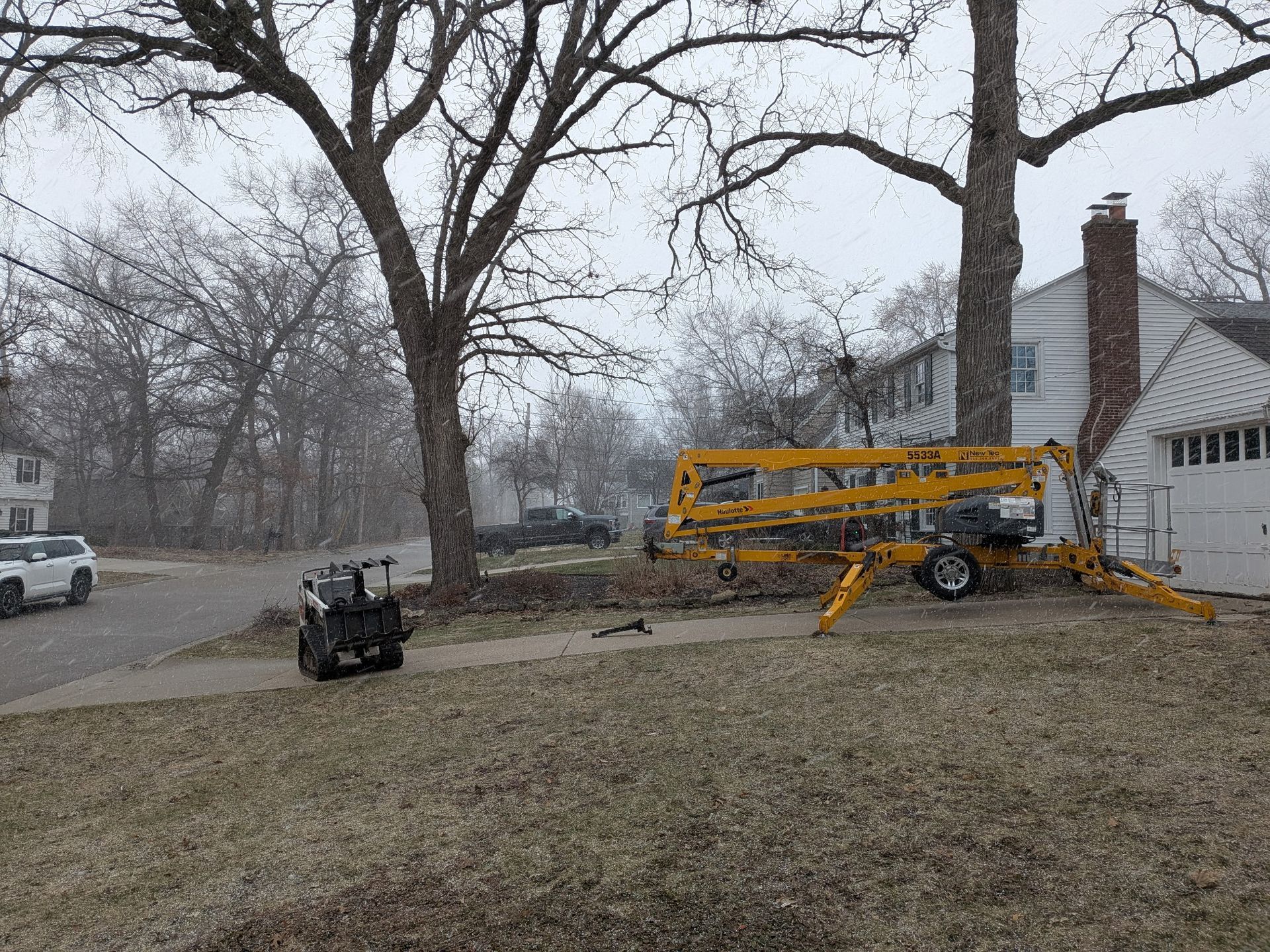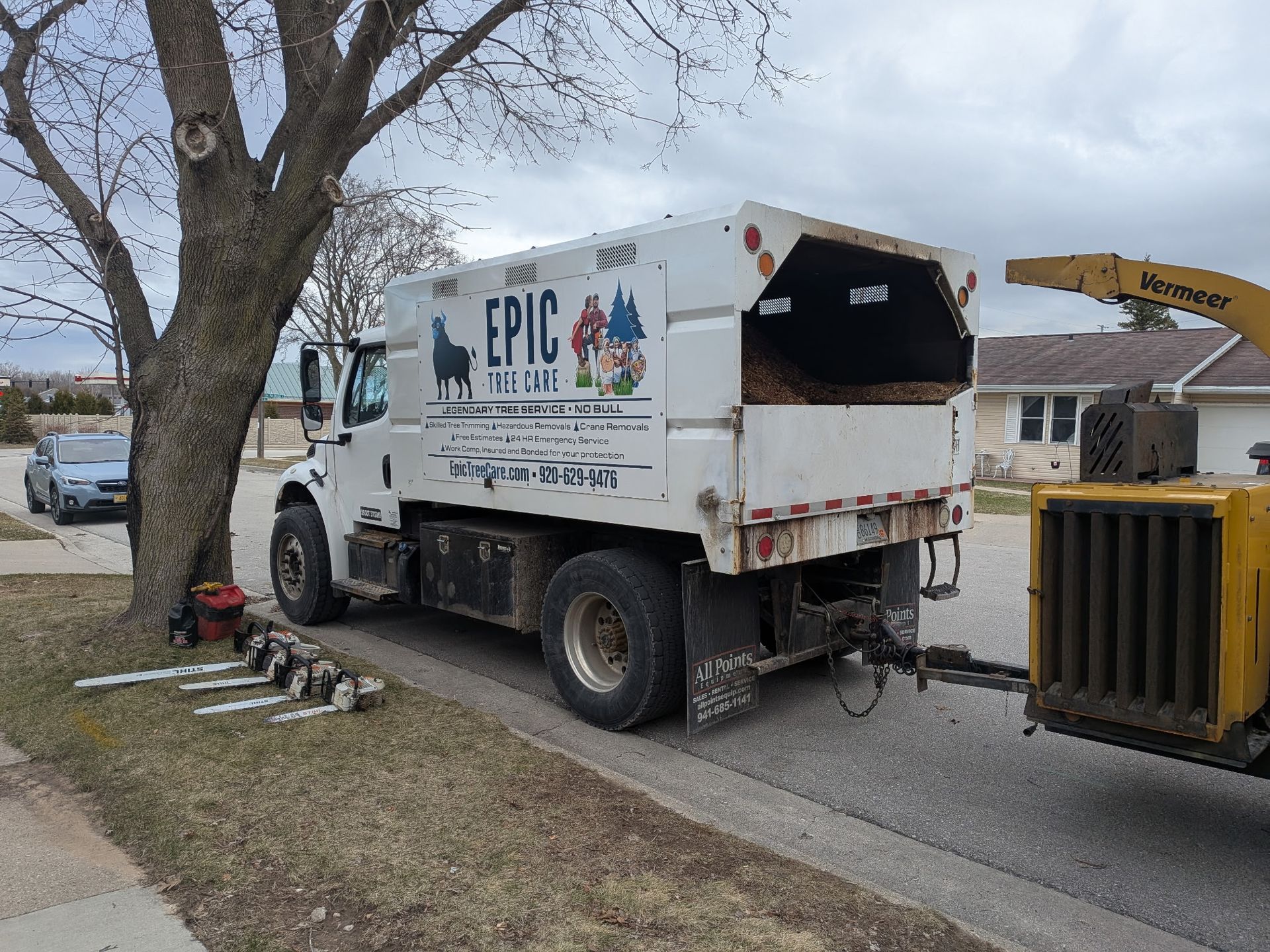 Epic Tree Care crews begin a large residential tree removal in Green Bay, Wisconsin, using specialized equipment to safely clear a towering tree near power lines and nearby homes.