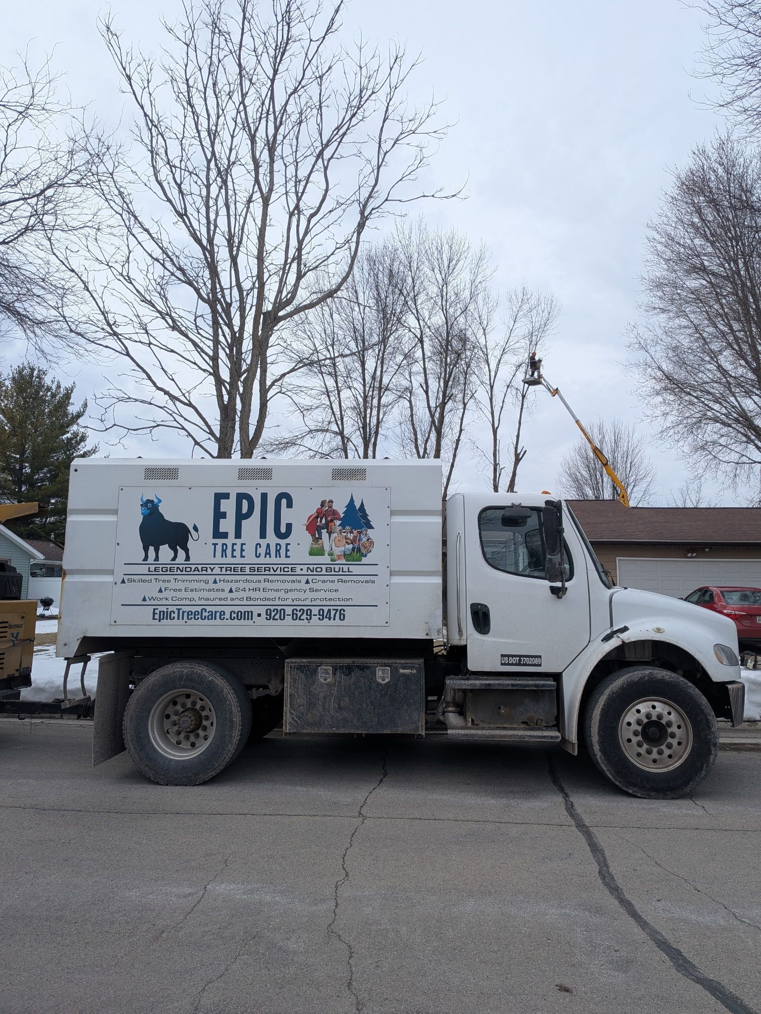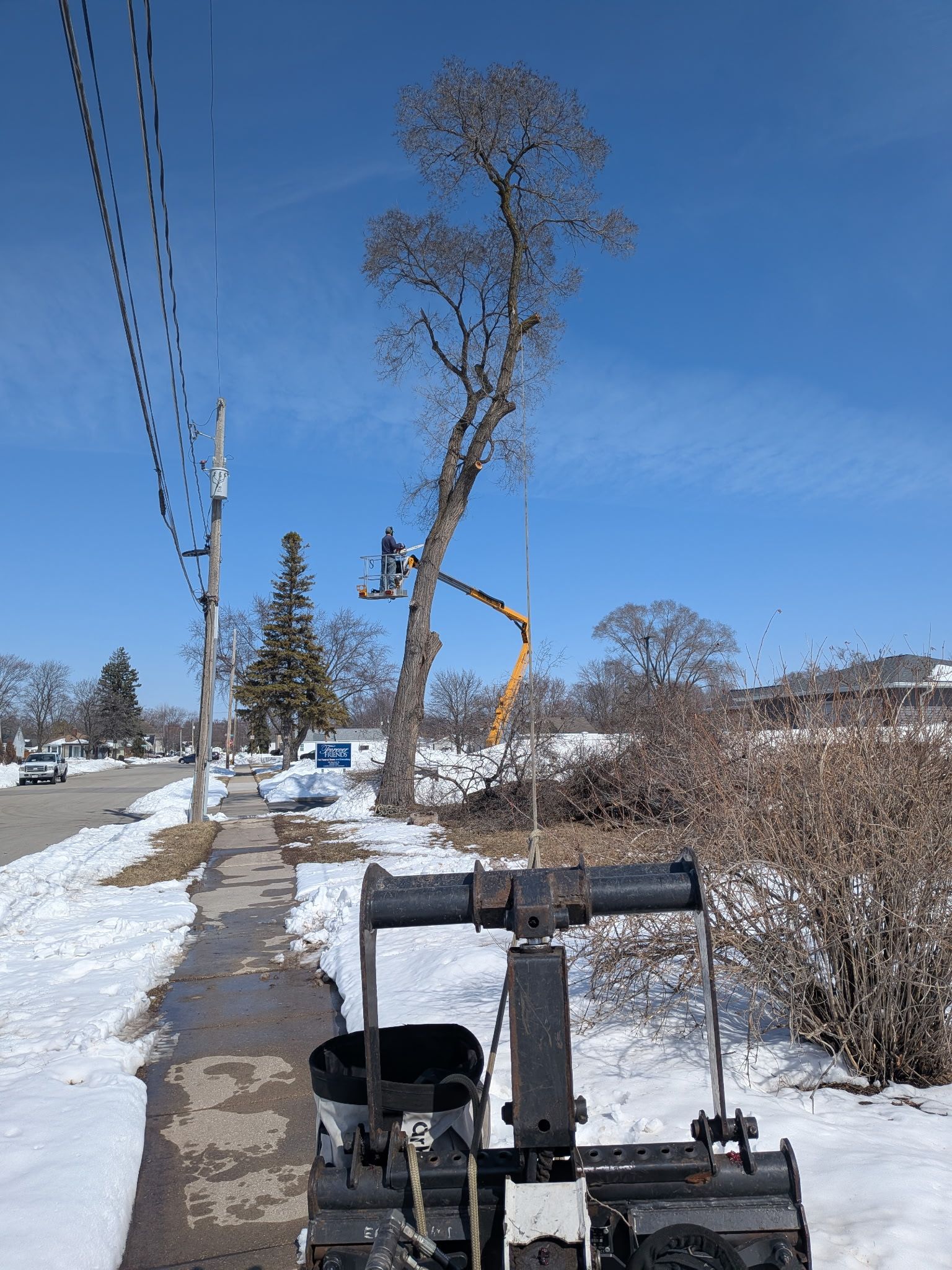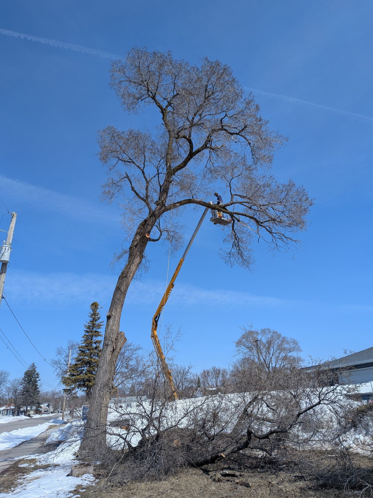 Epic Tree Care crews begin a large residential tree removal in Green Bay, Wisconsin, using specialized equipment to safely clear a towering tree near power lines and nearby homes.
