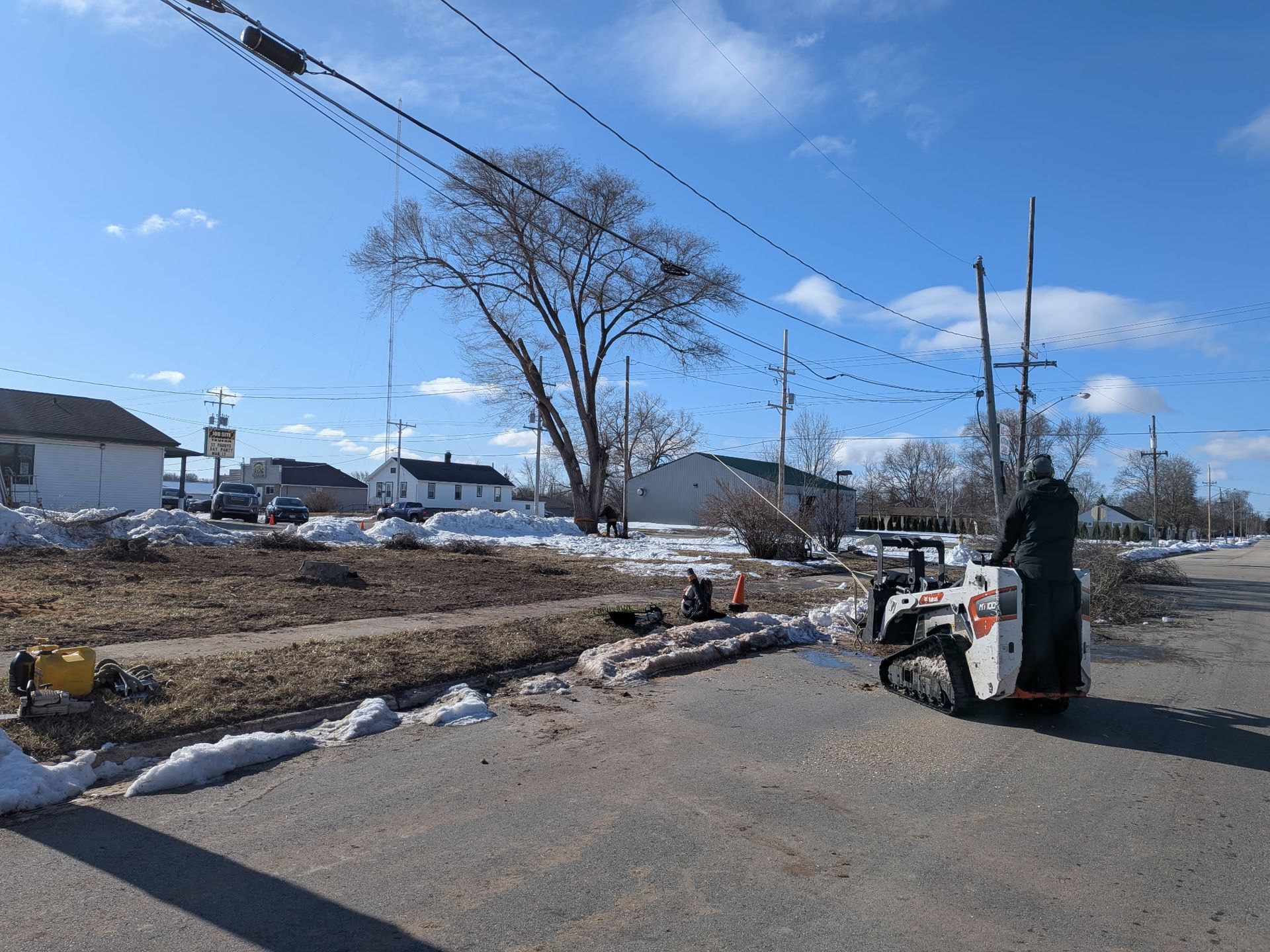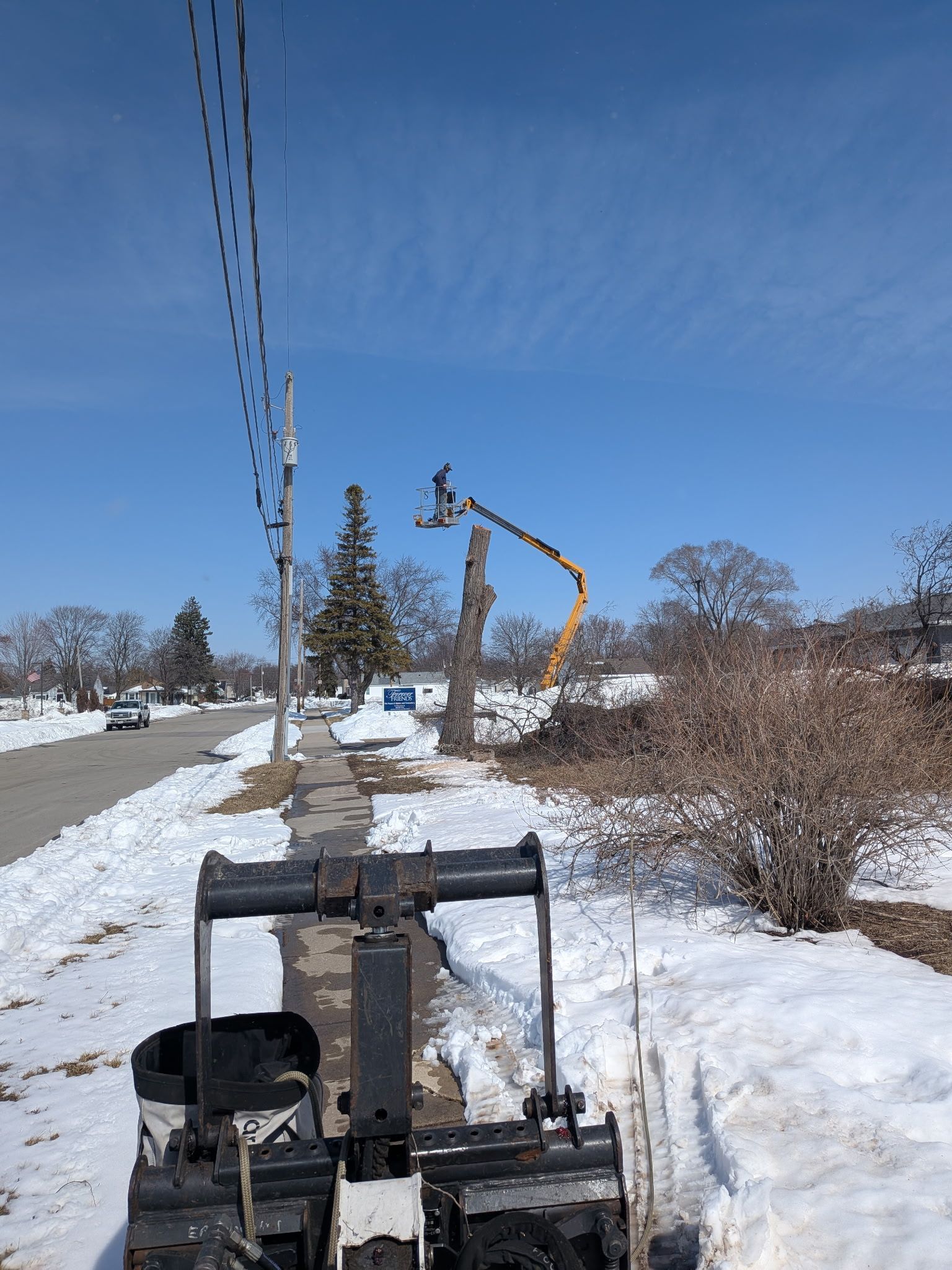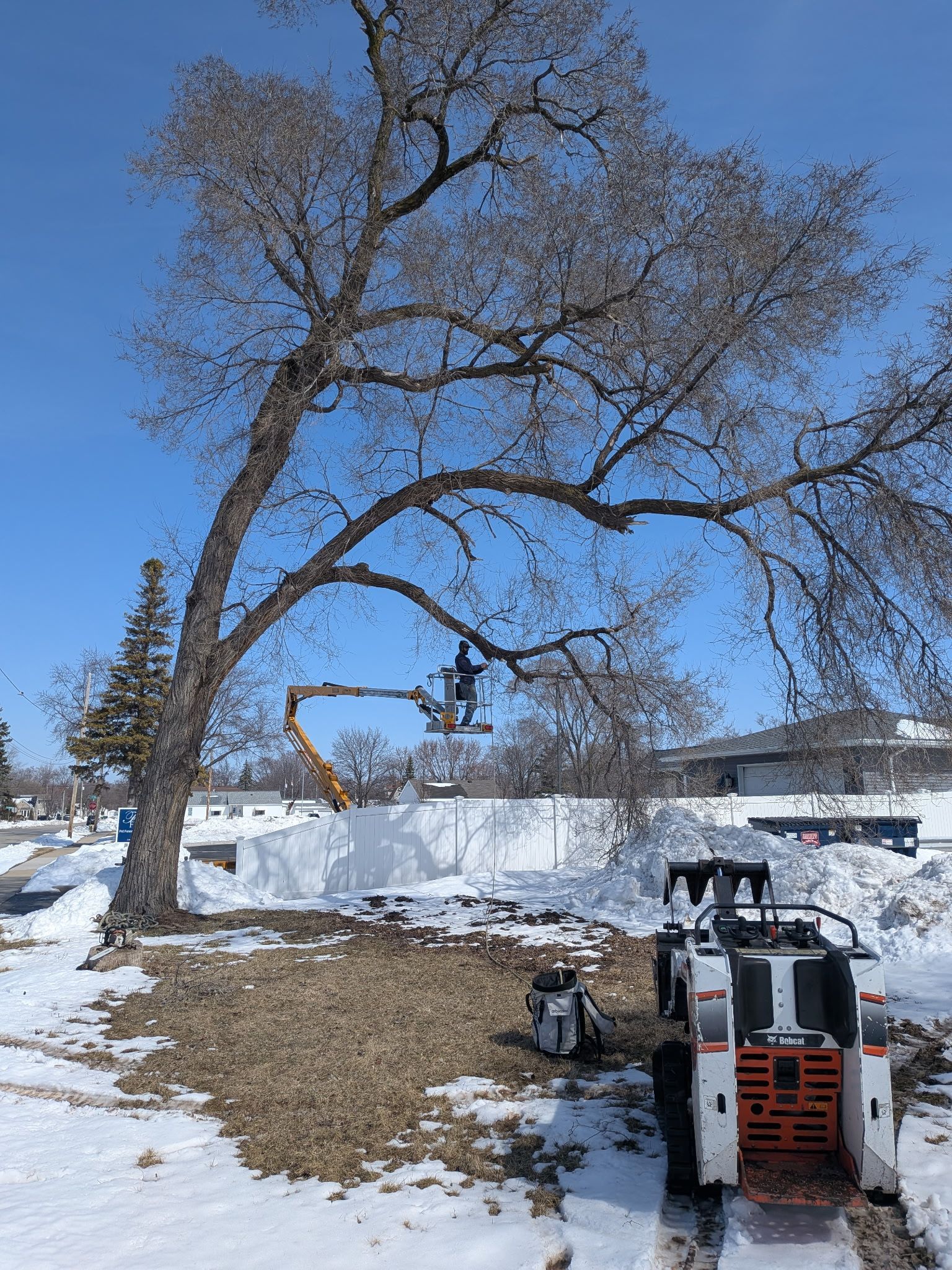 Epic Tree Care crews begin a large residential tree removal in Green Bay, Wisconsin, using specialized equipment to safely clear a towering tree near power lines and nearby homes.