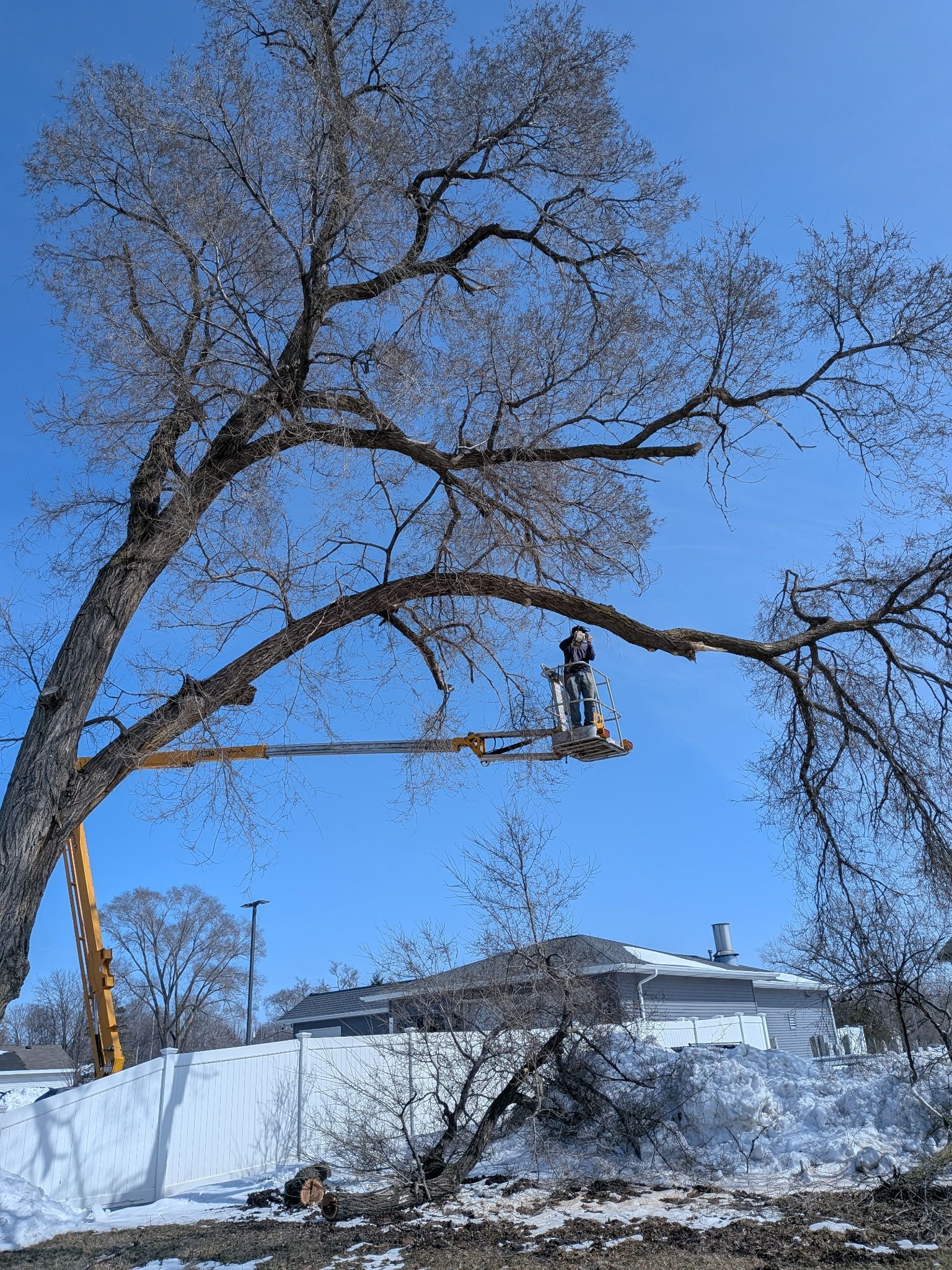 An Epic Tree Care technician works from an elevated bucket lift to carefully remove upper limbs during a residential tree removal project in De Pere Wisconsin, with freshly cut logs stacked neatly below in the yard.